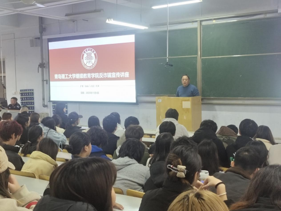 为切实增强在校学生的法治观念与反诈防骗意识,切实保障学生财产安全和身心健康,11月4日下午,继续教育学院在1号教学楼200阶成功举办了反诈宣传讲座。讲座特邀青岛市公安局市北分局陈虹同志担任主讲嘉宾,采用“视频学习+案例剖析+实操引导”的形式,为近四百名师生带来了一堂实用而生动的反诈课程。