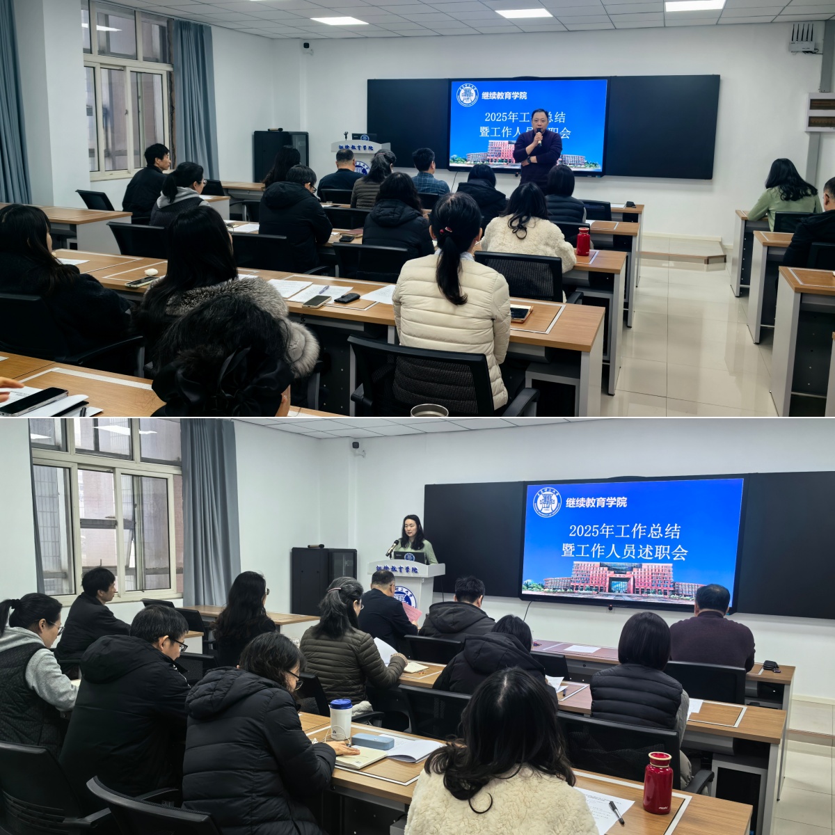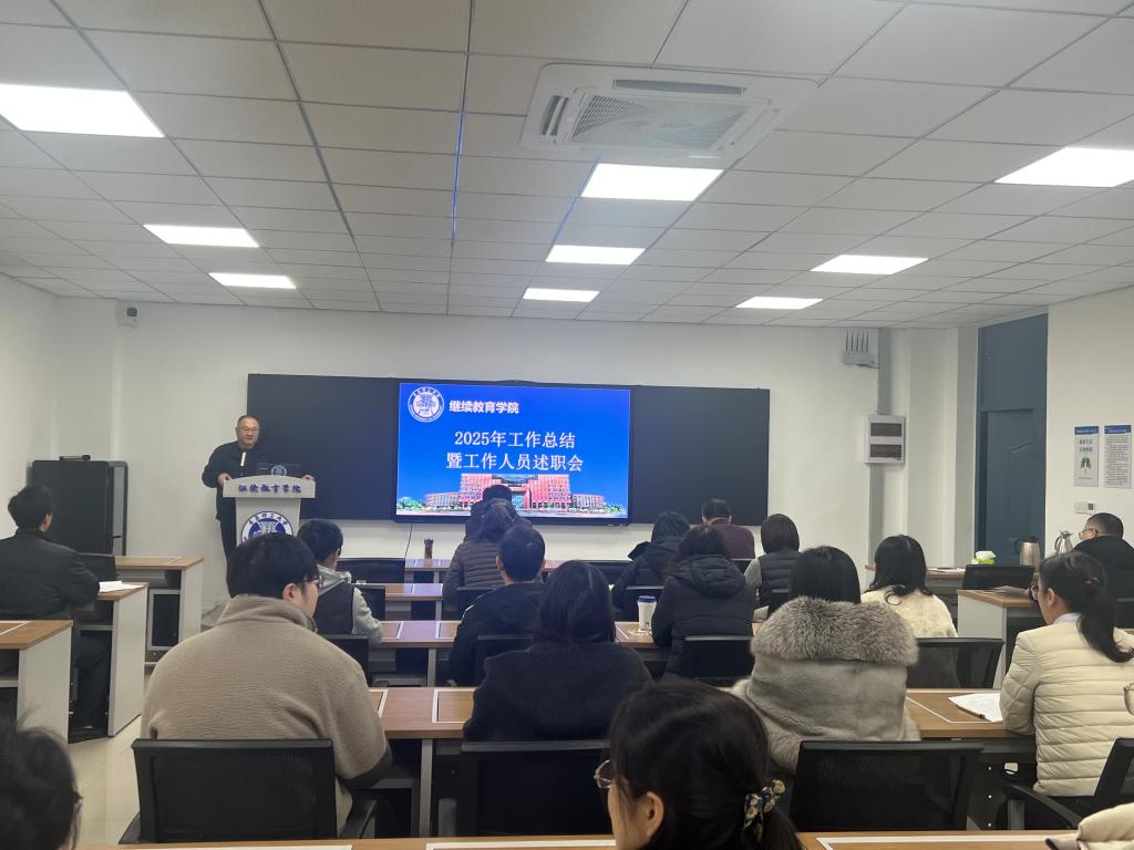 1月29日,继续教育学院召开2025年工作总结暨工作人员述职会议。党总支书记孙川三、副院长(主持工作)贾玉跃,党总支副书记、副院长徐佐君、副院长石慧、各中心、部室主任及全体教职工齐聚一堂,全面回顾2025年工作成果,共同谋划2026年发展蓝图。