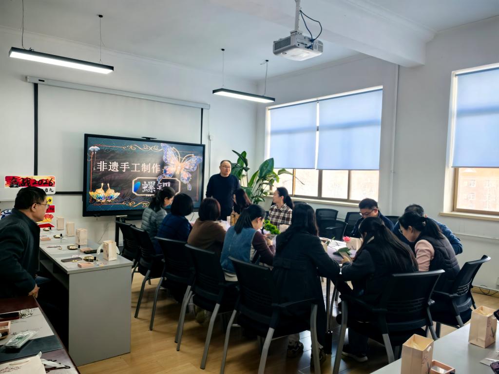 学院特邀非遗手工专业老师现场授课,细致讲解螺钿工艺的历史渊源、文化内涵与制作技巧,从选材搭配、造型设计到细节打磨,一步步进行实操演示与耐心指导。老师们围坐在一起,凝神聆听讲解、用心动手创作,遇到疑问主动交流请教,在指尖创作中感受传统非遗的独特魅力,现场欢声笑语不断、互动氛围热烈。
